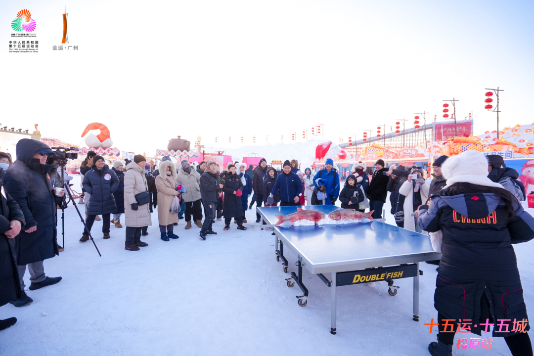 当地民众与各地游客积极参与乒乓球快闪活动,在户外零下八度打一场火热的“冰”乓比赛。当地小朋友不少是奥运冠军刘诗雯与世界冠军林高远的小粉丝,他们为即将参加十五运乒乓球混双项目的这对广东队“诗和远方”组合呐喊助威。活动现场还进行南北两地名优特产砂糖桔、迟菜心与胖头鱼互赠,情感与文化交织碰撞,奏响两地“双向奔赴”的乐章,也点燃全民迎全运的热情。