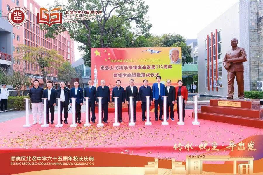 钱学森先生是世界著名的科学家、空气动力学家、中国载人航天奠基人。借由本次校庆,该校举行了纪念人民科学家钱学森诞辰113周年暨钱学森塑像落成揭幕仪式。值得一提的是,钱学森之子、钱学森教育工作委员会主任委员、上海交通大学钱学森图书馆馆长钱永刚教授还亲临佛山,亲临该校,在大会上亲自宣读关于北滘中学开办钱学森实验班的批复文件,并向学校授牌。