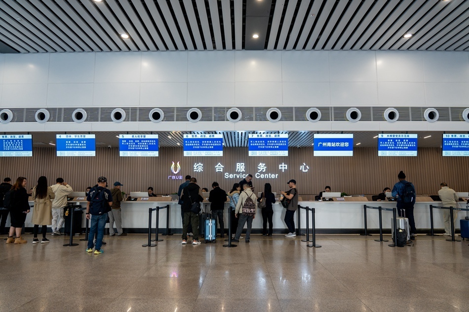 广州南站连接京广、广深港、贵广、南广、广珠等高铁及城际线路,是全国客流最大的高铁站,高峰期平均每50秒就有1趟高铁列车到发。广州南站今年全年到发旅客1.7亿人次,其中发送旅客近0.9亿人次。为进一步提升客运服务质量,广州南站打造了全新的综合服务中心,12个交互式人工窗口打破以往的玻璃隔阂。每一个票务服务窗口均为售退改一体窗,可实现旅客各类需求“一窗办”,其中,老人优享窗、团体票窗、学生票窗等为相应旅客提供优先办理服务。“初心·春澜”服务岗、爱心候车区、母婴候车室等服务区加强对儿童、携带大件行李者等旅客的引导帮扶,让旅客出行更温馨。