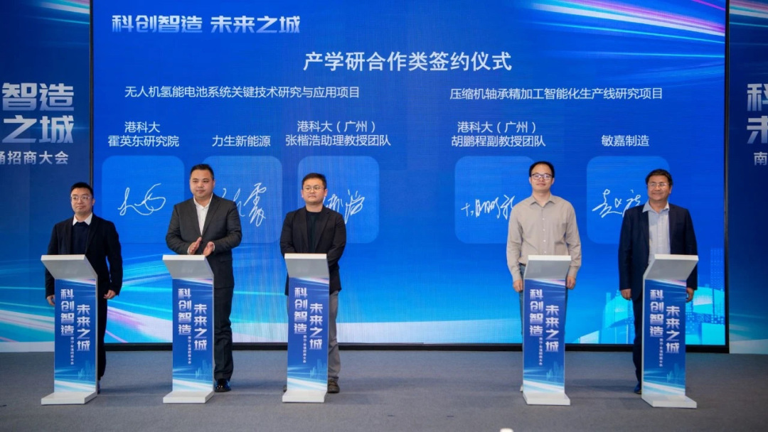 产学研合作类项目签约环节,港科大(广州)、港科大霍英东研究院相关教授团队与敏嘉制造、力生新能源等签署了无人机氢能电池系统关键技术研究与应用项目和压缩机轴承精加工智能化生产线研究项目产学研合作协议。