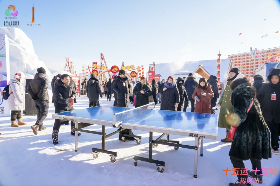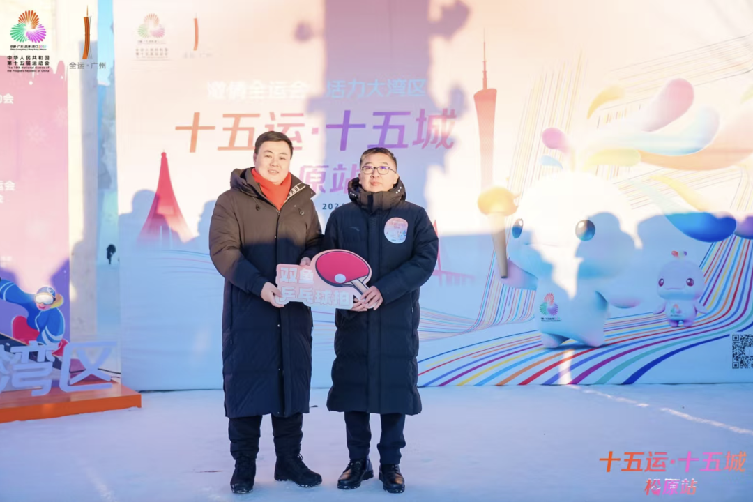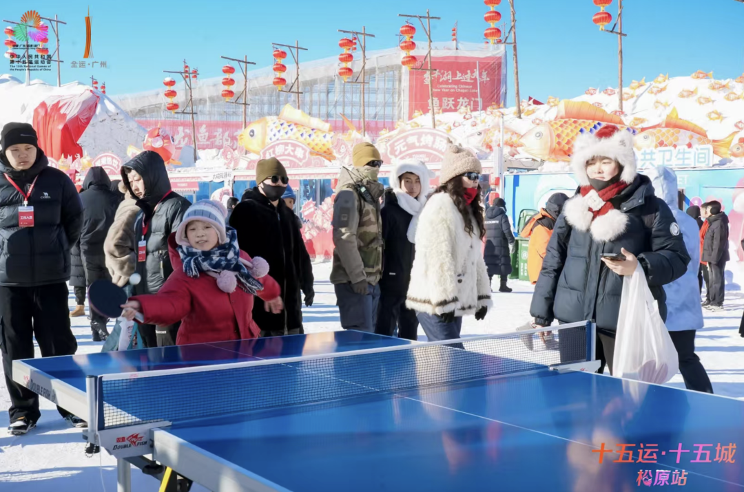 12月28日,“激情全运会,活力大湾区——十五运·十五城”松原站活动在查干湖举行,今天恰逢查干湖一年一度的冬捕节开启,广州松原“双向奔赴”,携手打造“全运鱼乐头条”。当地民众与各地游客积极参与乒乓球快闪活动,在户外-8℃打一场火热的“冰”乓比赛。当地小朋友不少是奥运冠军刘诗雯与世界冠军林高远的小粉丝,他们为即将参加十五运乒乓球混双项目的这对广东队“诗和远方”组合呐喊助威。活动现场还进行南北两地名优特产砂糖桔、迟菜心与胖头鱼互赠,情感与文化交织碰撞,奏响两地 “双向奔赴”的乐章,也点燃了全民迎全运的热情。