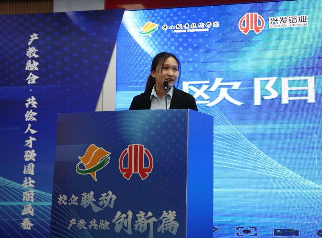 活动现场,佛职院优秀校友暨兴发铝业技术服务部产品设计工程师欧阳蝶意分享了她从学校走向兴发铝业的职业成长经历。