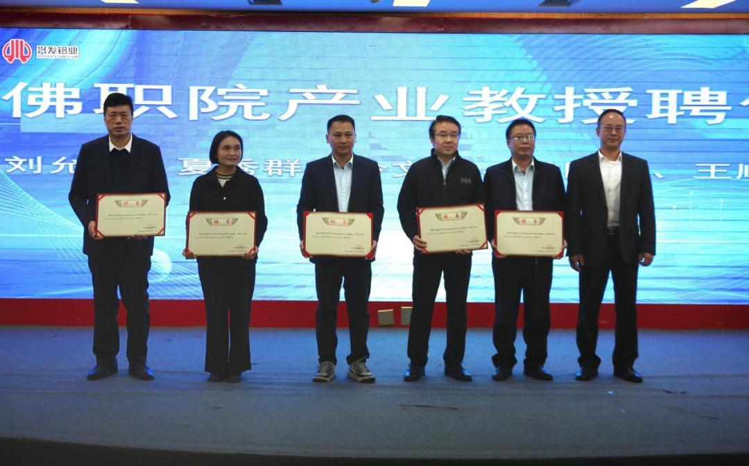 佛职院科技人才奔赴企业的同时,企业人才也向学校“双向奔赴”。活动现场,兴发铝业副总经理刘允棠、理化检测中心部长夏秀群、挤压中心负责人冷文兵、技术中心技术专家侯陇刚、技术中心资深工程师王顺成获聘“产业教授”证书。