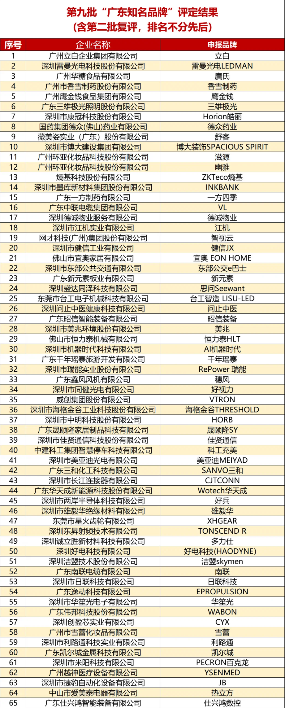 据悉,论坛现场揭晓了第九批广东知名品牌评定名单,立白、雷曼光电LEDMAN、廣氏、香雪制药、鹰金钱、三雄极光、Horion皓丽、德众药业、舒客、博大装饰SPACIOUS SPIRIT、滋源、幽雅、ZKTeco熵基、INKBANK、一方四季、VL、德诚物业、江机、智视云、健信JX、EON HOME宜奥、东部公交e巴士、新元素、思问Seewant、台工智造 LISU-LED、问止中医、昭信装备、美兆、HLT恒力泰、AI机器时代、千年瑶寨、RePower 瑞能、穗风、好视力、VTRON、海格金谷THRESHOLD、HORB、晟颐隆SY、佳贤通信、科工充美、美亚迪MEIYAD、SANVO三和、CJTCONN、Wotech华天成、两岸半导体、雄毅华、XHGEAR、TONSCEND R、多力仕、好电科技(HAODYNE)、洁盟skymen、南联、日联科技、EPROPULSION、华笙光、WABON、CYX、雪蕾、利路通、凯尔城、PECRON百克龙、YSENMED、JB、热立方、仕兴鸿数控等65个品牌上榜(含复评)。