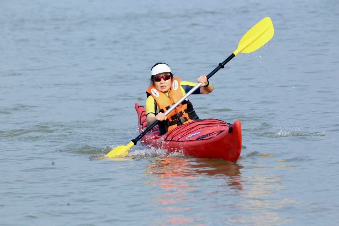 来自中山大学龙舟队的谢时屹跟同学一起来“团建”,虽然龙舟是团体项目,皮划艇则是个人项目,但她感觉划船的发力原理都一样,所以比赛时还多少有些优势,同时她读的是环境科学,一向最喜欢亲近大自然的户外运动,因此在周末参加这些短途的比赛,健身加旅行,她感到非常愉悦。
