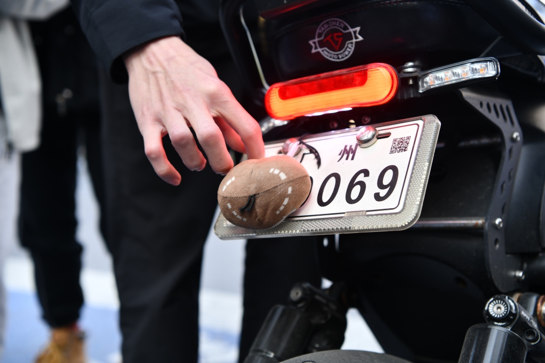 洗脸巾、口罩、公仔、布带……短短几分钟内,在海珠区江南大道同福东路口接连有四五名电动自行车骑行者因“花式”遮挡号牌被执勤交警拦下。其中,一名女子因用洗脸巾遮挡号牌和未佩戴头盔两种违法行为被罚100元。