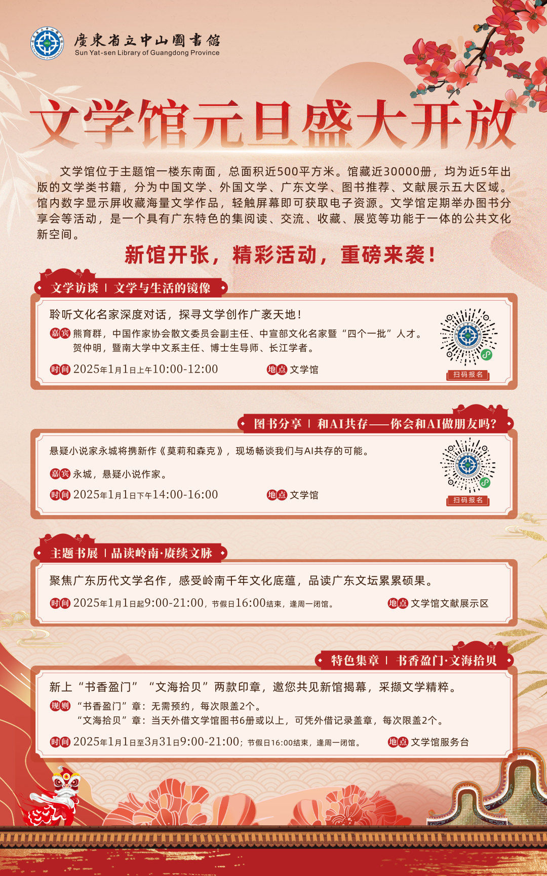 2025年元旦,广东省立中山图书馆正式开放全新服务区域——文学馆。省立中山图书馆将推出文化名家深度对谈、新年音乐会等精彩活动,与广大读者一起阅览新书,悦迎新年。