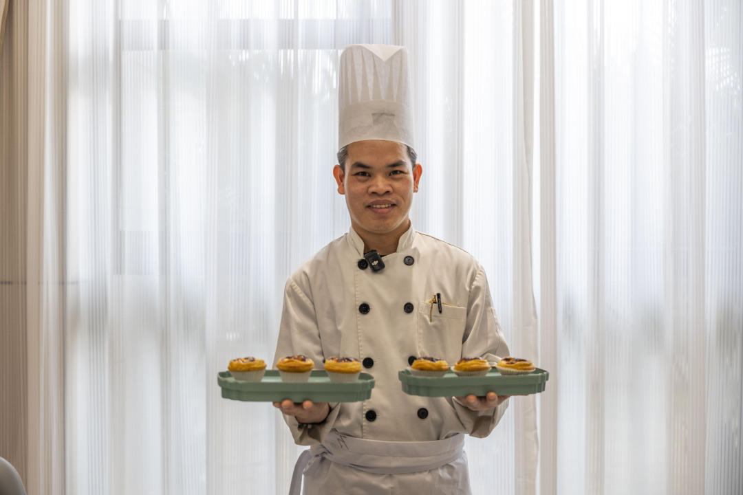 在澳门,记者拜访了国家餐饮中级技师、高级面点师龚考兴。在现场,龚师傅展示了葡式蛋挞制作过程:在面团做的挞皮中倒入牛奶、淡奶油、白糖、鸡蛋,再送入加热好的烤箱烘烤18分钟,奶香四溢的葡挞就烤好了。打开烤炉,热气扑面而来。一眼看去,每一只葡挞挞心都十分饱满,深褐色的焦糖散发出诱人的气息。
