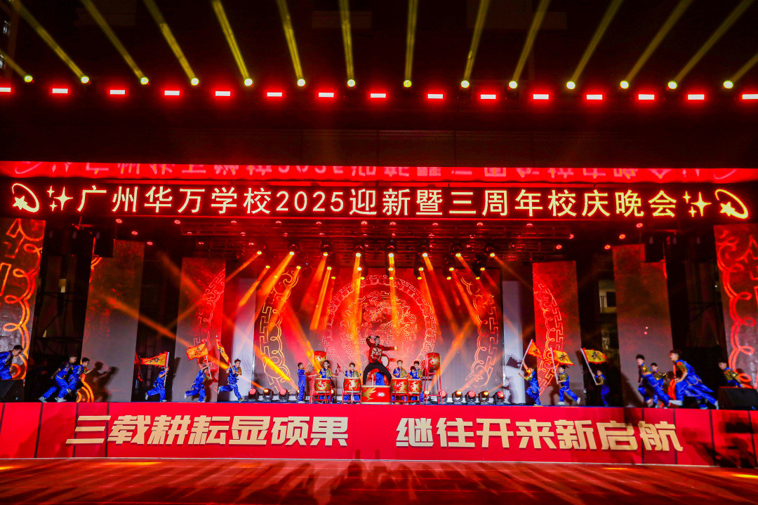 据介绍,广州华万学校此次举办的2025迎新暨三周年校庆晚会,节目全部由华万师生共同创作、演绎。晚会在“三载耕耘显硕果,继往开来新启航”的主题下,以“共创美好教育未来”为线索贯穿三大篇章,寓意“赓续文脉·源远流长”“奋进时代·勇立潮头”“惟实励新·扬帆启航”等,展现华万校园昂扬奋进的精神面貌,讲述“崇德尚美·勤学向上”的校训文化与“敢为人先·超越自我”的华万精神。