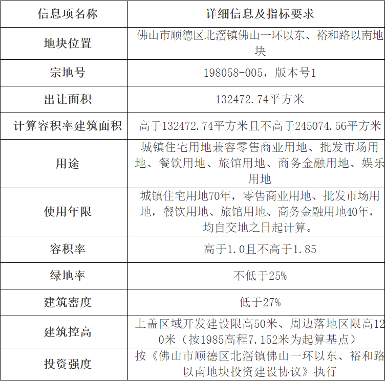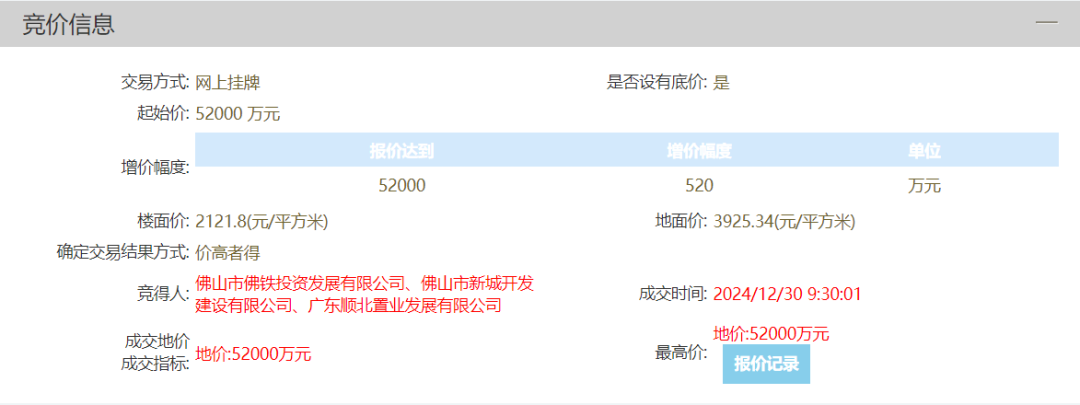 12月30日,记者从佛山市公共资源网获悉,佛山市佛铁投资发展有限公司、佛山市新城开发建设有限公司、广东顺北置业发展有限公司联合以5.2亿元(52000万元)联合摘得顺德区北滘镇佛山一环以东、裕和路以南地块,地块总面积达132472.74平方米,折合楼面价为2121.8元/平方米。