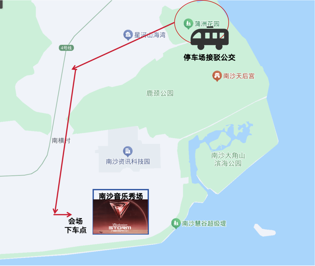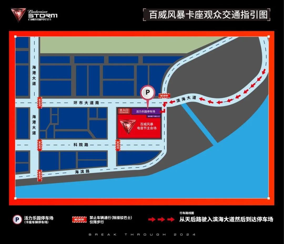 凭相关车证从大角二路(即滨海大道)驶入海滨路,最终停放在南沙活力乐园内,而后从卡座通道进入主会场。