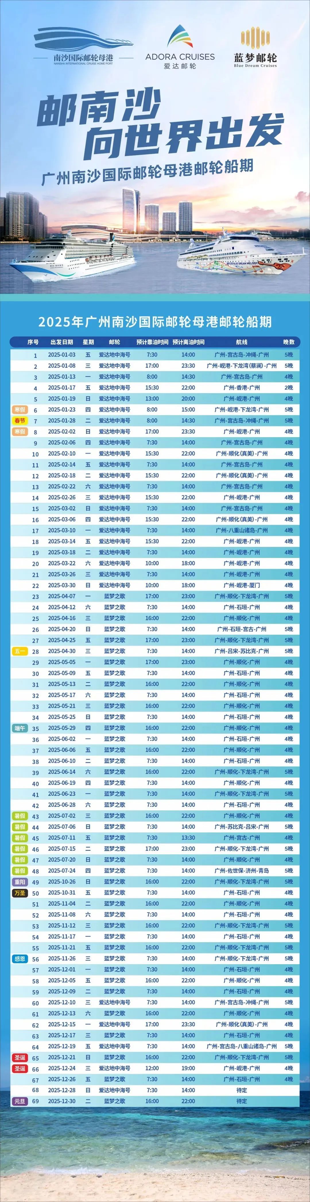 2025年广州南沙国际邮轮母港邮轮船期近日发布,船期从明年1月份开始持续至明年年底,期间预计将有69趟邮轮航次从南沙出发,驶往日本、越南等地。