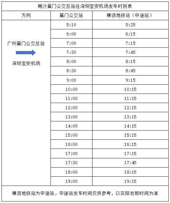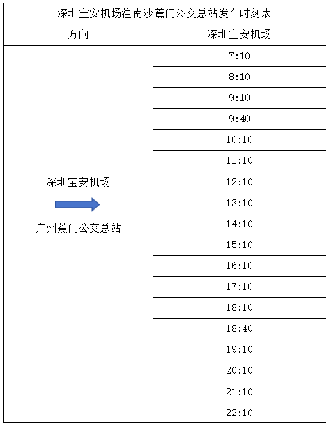 南沙蕉门公交总站往深圳宝安机场方向服务时间为05:10—19:00。