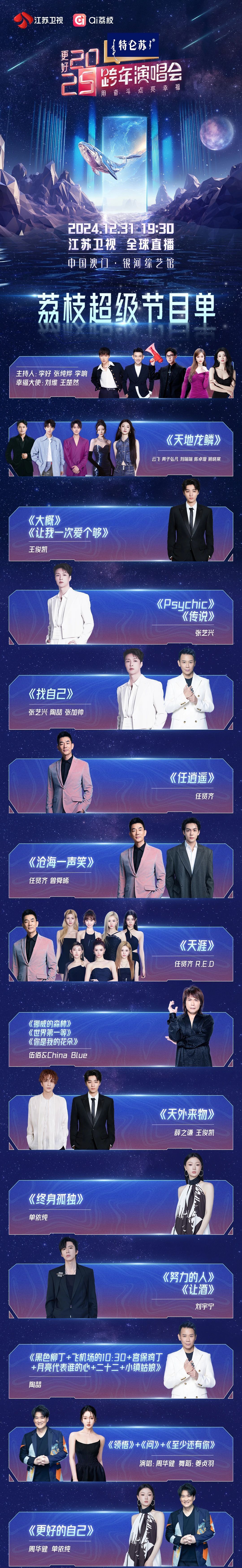 再次登上荔枝跨年舞台的刘宇宁,用一曲《努力的人》唱出追梦者的心声,以《让酒》描摹对未来无尽的期待;潘玮柏先后搭档刘端端、TOP登陆少年组合,唱响经典曲目《我的麦克风》《Coming Home》,老歌新唱别有一番风味;陶喆带来《黑色柳丁》《飞机场的10:30》等六首歌曲串烧,让观众一次性听过瘾;实力唱将薛之谦,既有魅力独唱《租购》《我好像在哪儿见过你》《丑八怪》《刚刚好》,又将联手王俊凯演绎《天外来物》、搭档郭冠廷演唱《到这》,把“薛式情歌”唱进多少人的心坎里;周华健带来《领悟》《问》《至少还有你》三首经典老歌,旋律响起便提前预订万人大合唱的“名场面”;曾舜晞搭档王楚然唱响《心愿便利贴》,为新的一年积攒无数小确幸;王俊凯带来《大概》《让我一次爱个够》两首歌曲,唱出阳光少年的细腻情感;李宇春继续零点压轴登场,用《2005-2025跨年组曲》《回春天》,回望出道二十年的音乐历程,传递不一样的音乐态度。
