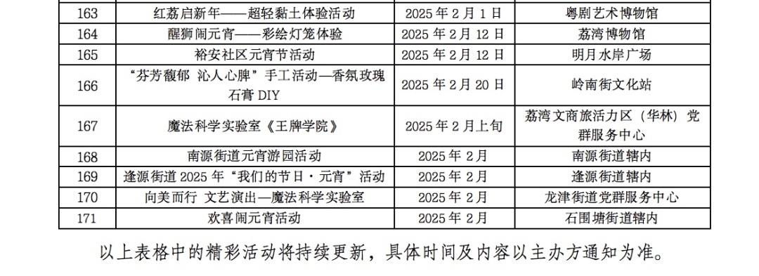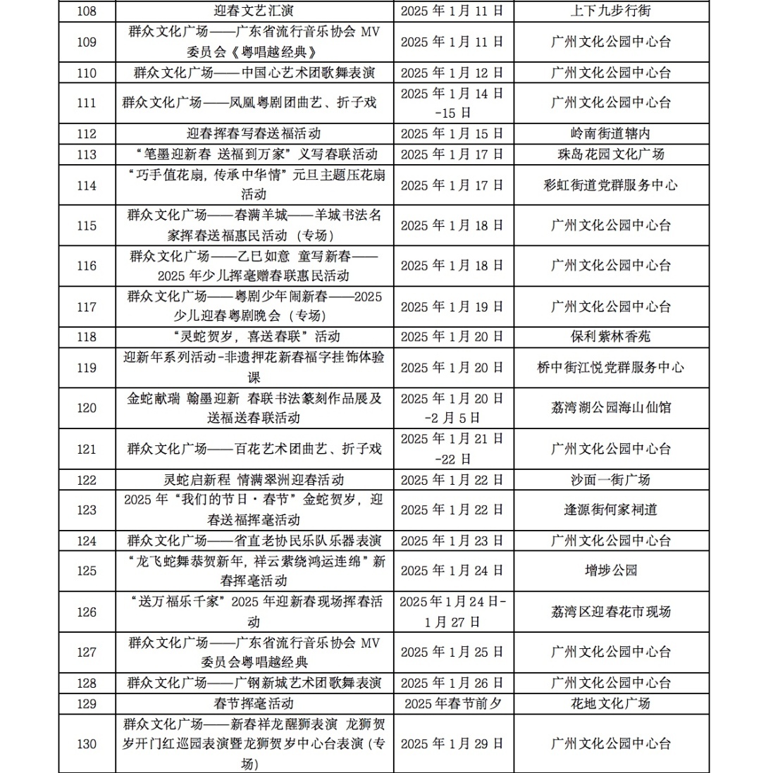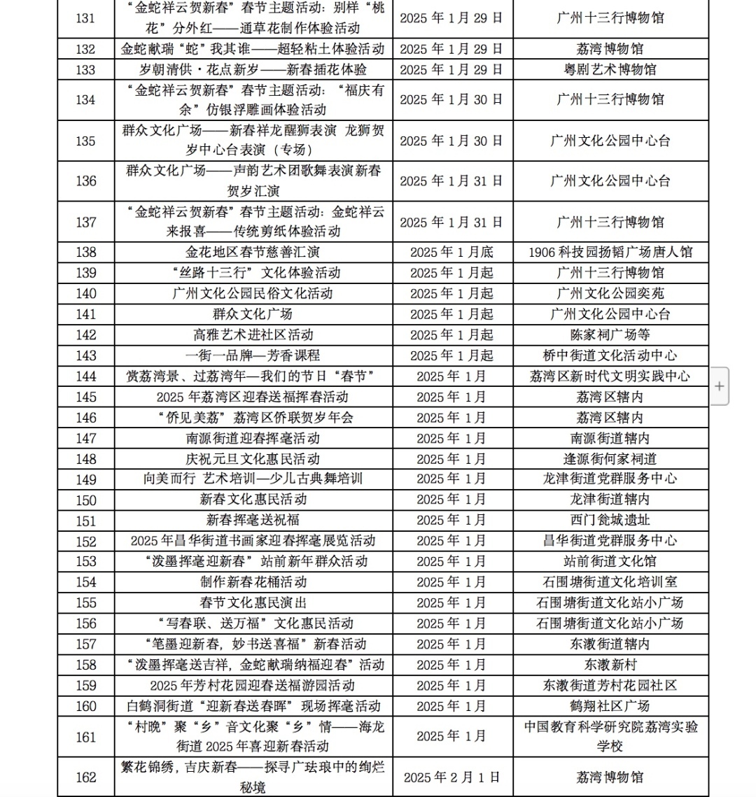 荔湾区博物馆开展“一帆风顺启新年”——通草画绘画体验、“金蛇祥云来报喜”——传统剪纸体验、“醒狮闹元宵”——彩绘灯笼体验等丰富多彩的体验活动,广州文化公园推出讲古、灯谜会、电影展播等一系列接地气的新年惠民活动,让市民们感受到“家门口的年味”。辖内各公共文化服务阵地联动开展多场迎春送福活动,写福字、送挥春,一笔一划承载人们对新年的美好祝愿,让年味在笔端升华。组织开展文艺惠民演出、新年游园等丰富多彩的惠民活动,增进邻里情和增强社区居民的幸福感。