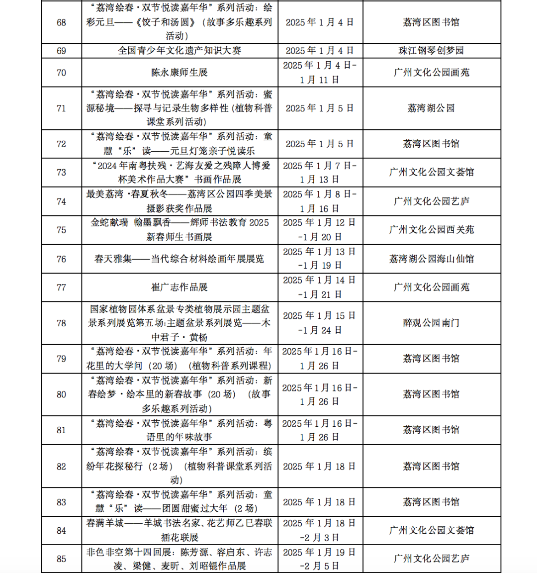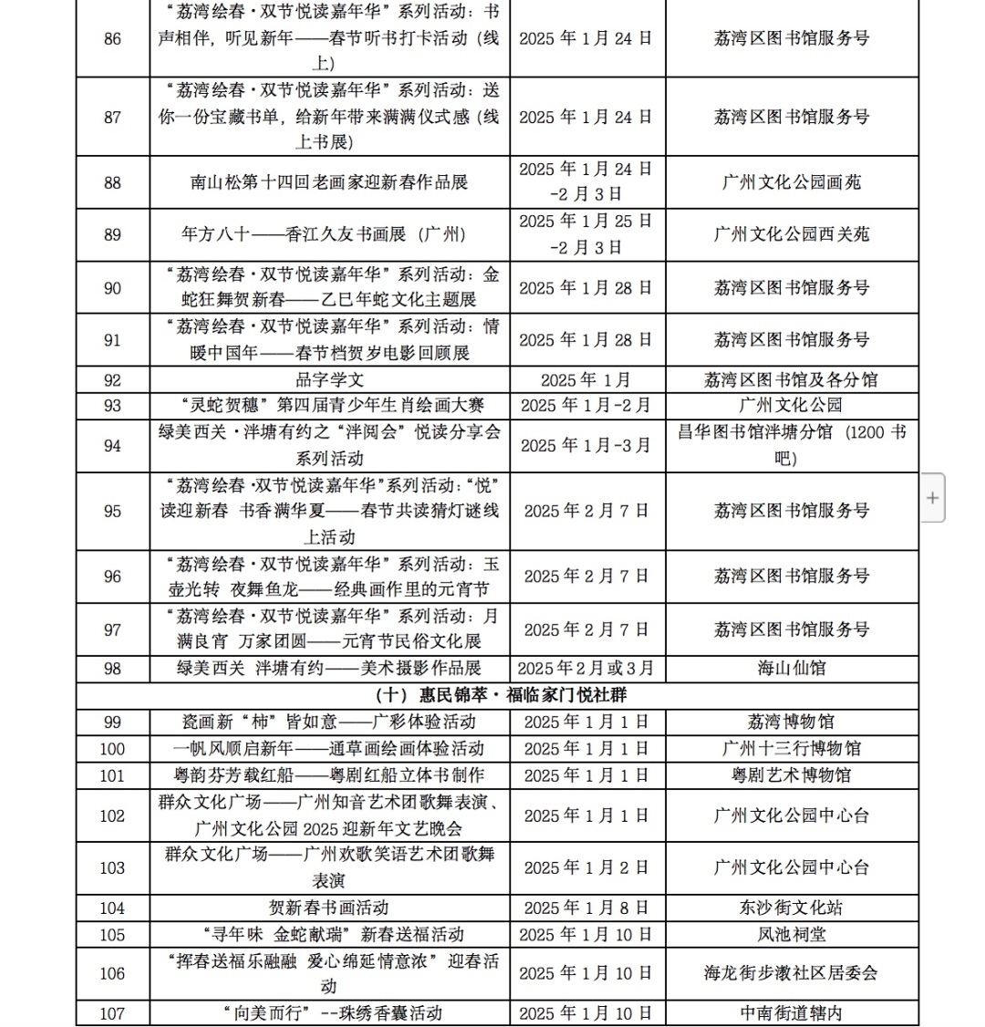 白鹅潭大湾区艺术中心持续展出“都在新年梦里逢”——广东美术馆馆藏民间艺术专题展、新兴木刻与广东版画——广东美术馆藏木刻版画专题展等艺术精品展览,“泮塘初见 荔人同行”——美术作品联展等展现本土人文风情的荔湾特色文艺展览也持续上新,以墨香雅韵点亮城市文化之光。“荔湾绘春·双节悦读嘉年华”系列活动生动展示书香悦读之美,围绕生肖、年花、贺岁电影等新年氛围浓厚的主题,推出专题展览、绘本阅读、讲座培训、亲子体验等阅读活动,让“处处有书伴、时时闻书香”的全民阅读氛围更加浓厚。
