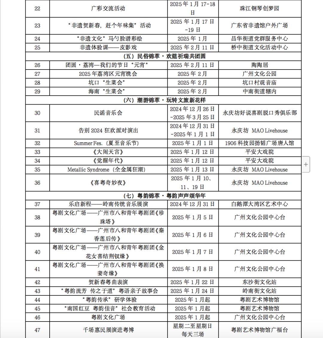 元旦春节期间,粤剧艺术博物馆广福台不仅将继续每天呈现三场粤剧惠民演出,更有省市级高水平粤剧曲艺团体献上新年精品粤剧大戏。广州文化公园粤剧文化广场也将带来新年粤剧专场,经典新编汇聚,好戏永不停歇。跨年夜更有“乐启新程——岭南传统音乐展演”在白鹅潭大湾区艺术中心盛大举行,带领广大市民和游客走进“中国曲艺之乡”“中国民间文化艺术之乡”,近距离欣赏粤剧粤曲的独特魅力,感受粤剧粤曲生态保护实验区的深厚文化底蕴。