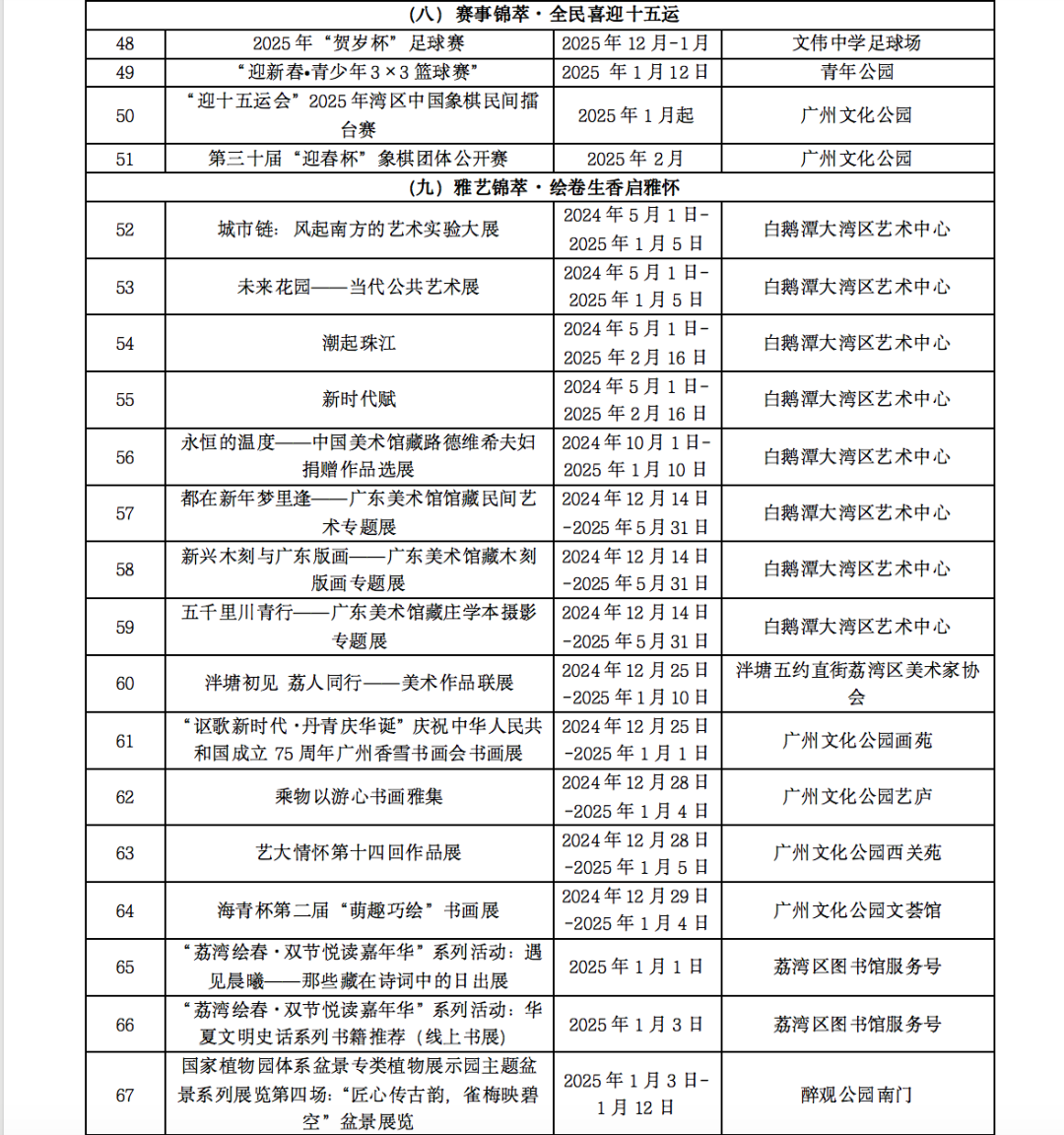 2025年第十五届全国运动会将于粤港澳三地举行,荔湾积极推动全民迎全运,展全运魅力,映湾区光彩。新年期间,聚焦传承传统棋文化,开展“迎十五运会”2025年湾区中国象棋民间擂台赛、第三十届“迎春杯”象棋团体公开赛,以棋会友、以赛促健,用精彩对弈开启新年新篇章。大力弘扬全民健身精神,荔湾将举办“迎新春·青少年3×3篮球赛”、2025年“贺岁杯”足球赛等群众喜闻乐见、参与度高的体育赛事,激发市民群众参与全民健身热情,打造荔湾特色的新年体育盛会。
