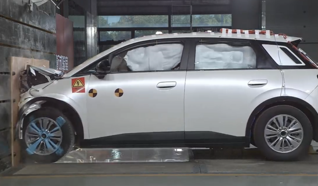 实验车辆通过铰链拖行加速至碰撞初始速度56km/h,出于安全起见需要在监控室看碰撞过程。碰撞结束后。埃安UT四个车门正常打开,安全气囊全部点爆。与此同时,测试车辆高压电安全,低压电安全。