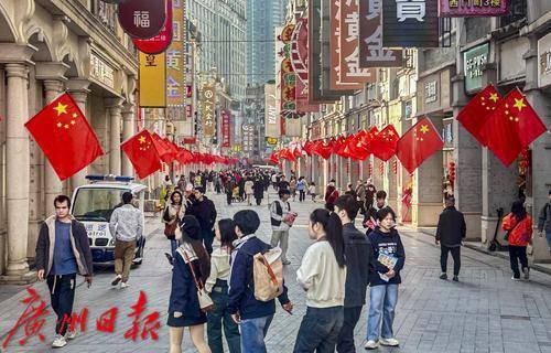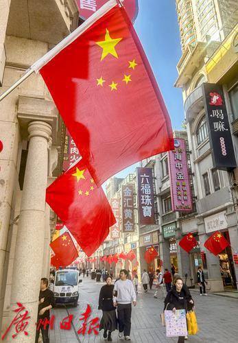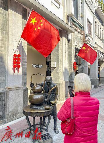 上下九步行街两边的骑楼挂满鲜艳的五星红旗。