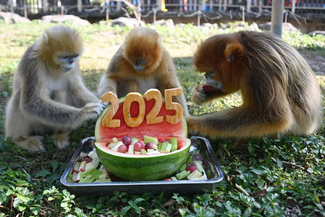 金丝猴岛里,还未等饲养员把食物放好,在树上玩耍的金丝猴早已垂涎欲滴,纷纷迅速跳下来,它们各自选择适合的就餐位置,相处得十分融洽,一起乐享“2025新年第一餐”。