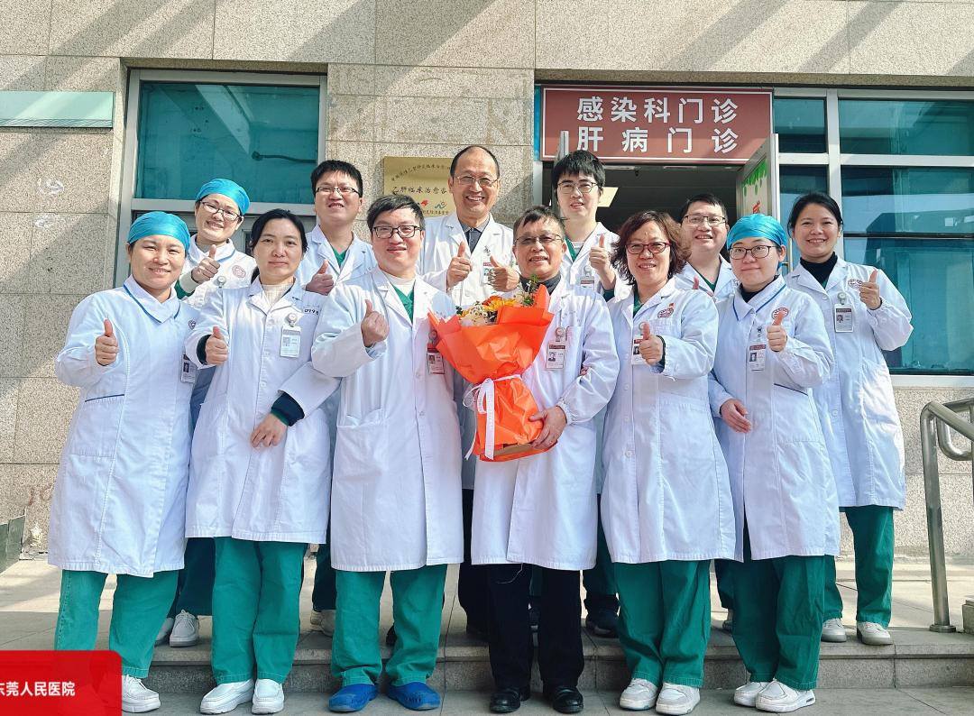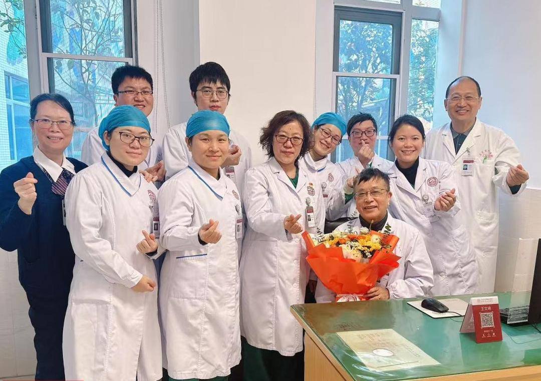最后一个工作日的中午,东莞市人民医院感染科主任何松美带着全科医护人员来给王文琦教授献花,他们一起合影留念,从今往后,在东莞市人民医院感染科的诊室就再也见不到王文琦教授了。