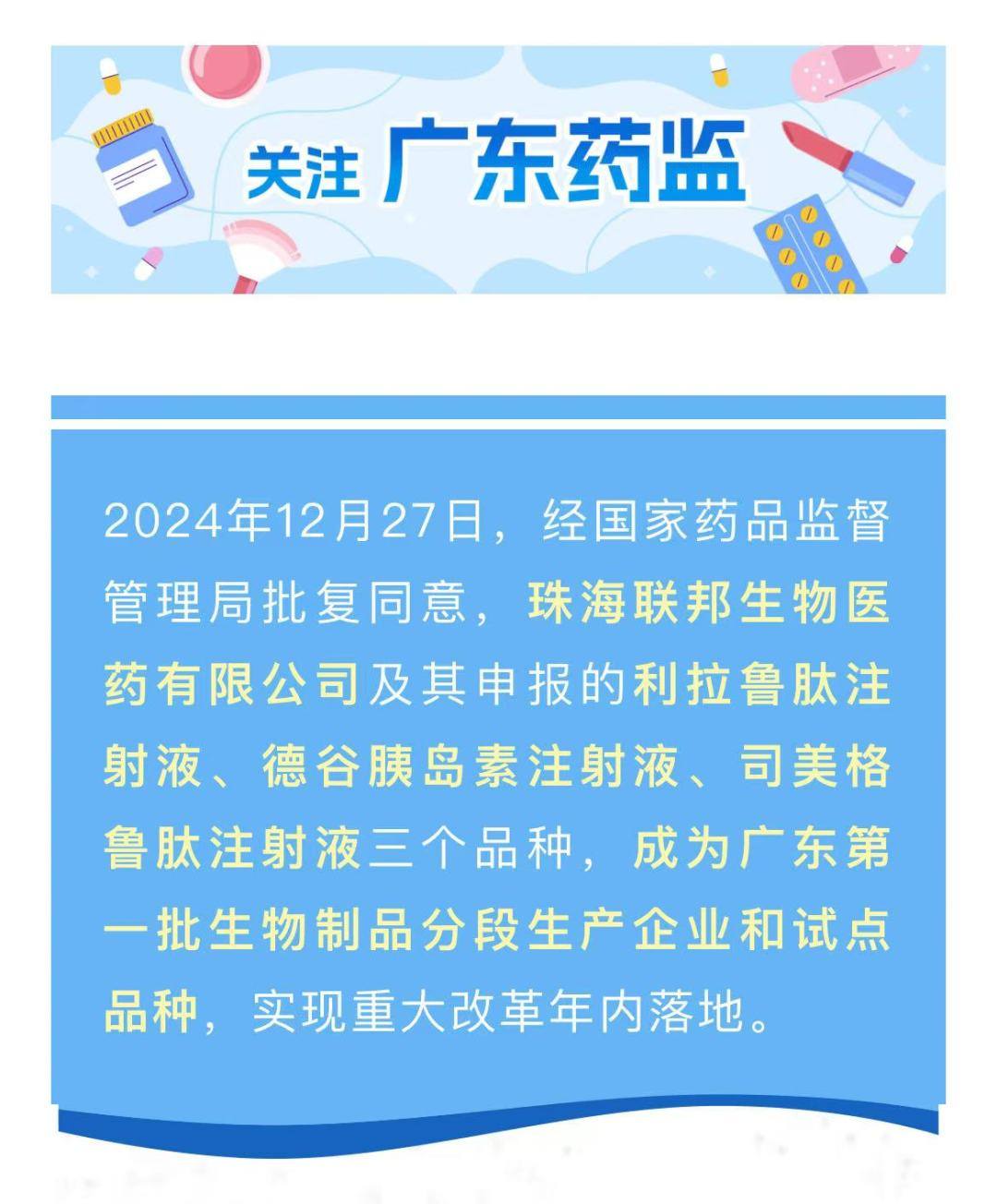 广东省药监局官方微信公众号“广东药监”日前发布消息称:经国家药品监督管理局批复同意,珠海联邦生物医药有限公司及其申报的利拉鲁肽注射液、德谷胰岛素注射液、司美格鲁肽注射液三个品种,成为广东第一批生物制品分段生产企业和试点品种,实现重大改革年内落地。