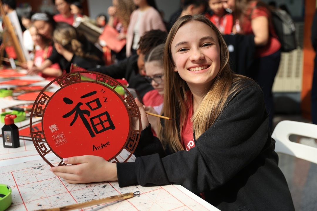 “什么是福?”在传统文化体验环节中,广州市少年宫美术骨干教师梅莉从“福”的具象意义、“福”字的演变历史和故事以及“福”字在民间习俗的应用引入,选取宣纸木质镂空挂件为载体,带领中美少年儿童近距离体验书法之美,感受中华优秀传统文化艺术的魅力。中美少年儿童纷纷拿起毛笔,在老师手把手的指导下,一笔一画写下刚刚学习的“福”字。