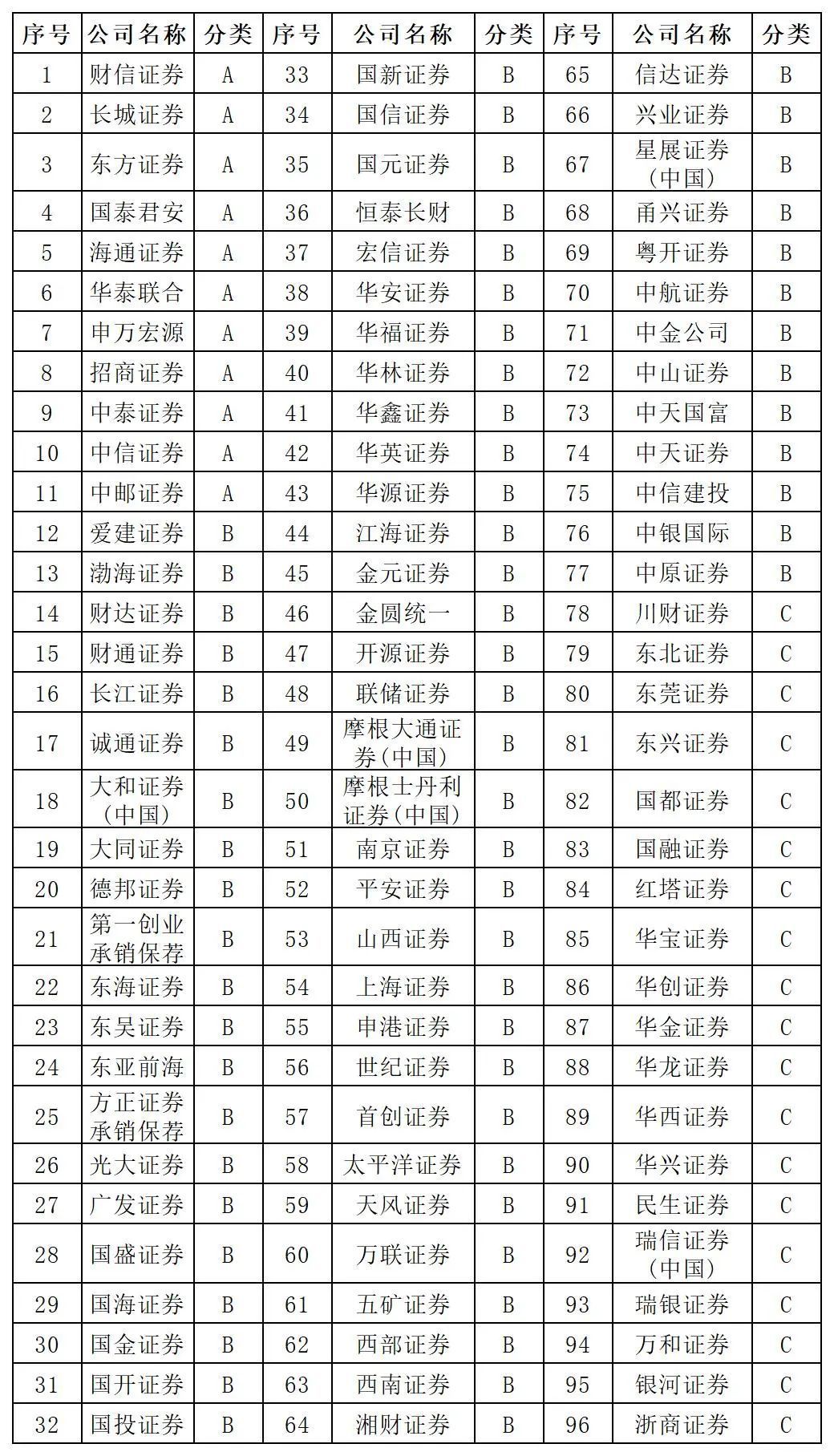 根据《证券公司投行业务质量评价办法》,评价结果分为A、B、C三类,本次评价结果A类11家、B类66家、C类19家。其中,A类券商包括财信证券、长城证券、东方证券、国泰君安、海通证券、华泰联合、申万宏源、招商证券、中泰证券、中信证券、中邮证券。