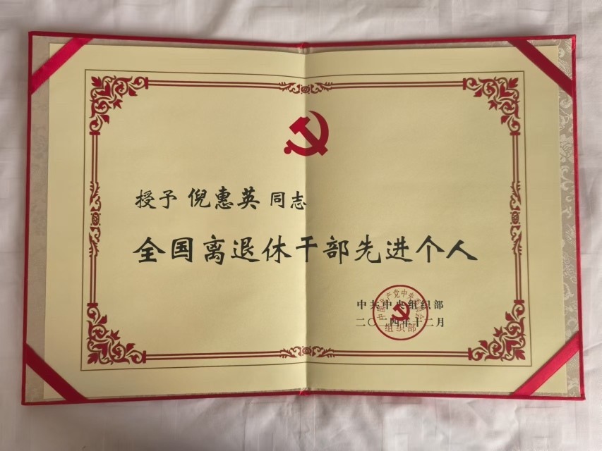 2024年12月30日,全国离退休干部先进集体和先进个人表彰大会在北京召开。倪惠英获评全国离退休干部先进个人。据悉,倪惠英还作为全国离退休干部先进个人受表彰代表之一,接受了习近平总书记的亲切接见。