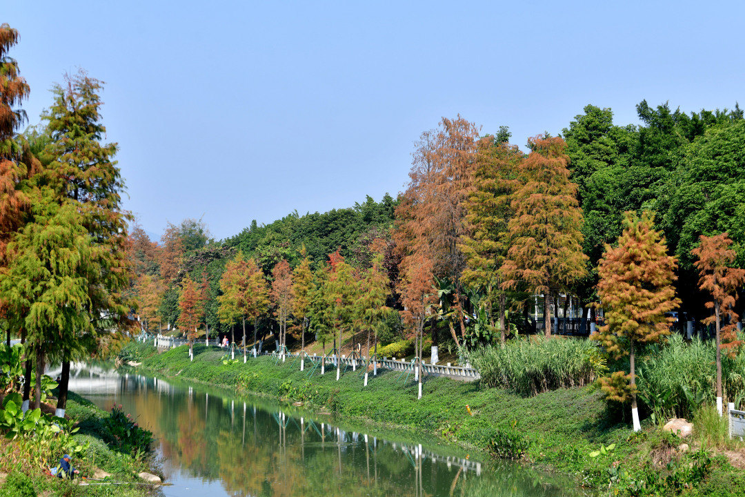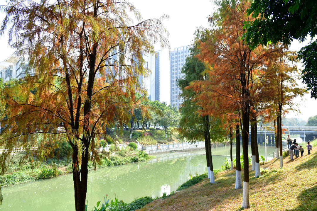 萝岗湿地公园河涌两岸的落羽杉林,看上去像一幅画。一年仅一次的黄埔冬日限定浪漫,找个时间来打卡吧。