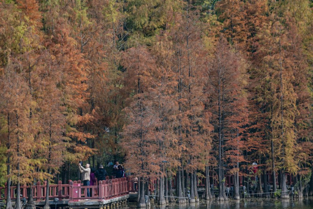 每年12月至次年1月,受气候变化影响,落羽杉会从绿色过渡为黄色,渐渐变为红色直到飘落。