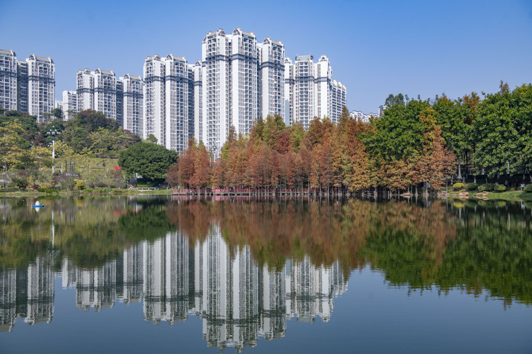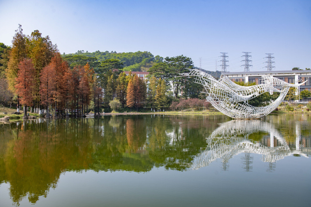 在创业公园,依然翠绿的树木与金黄的落羽杉,在湖畔两侧静静伫立,宛如大自然间打翻的调色盘。