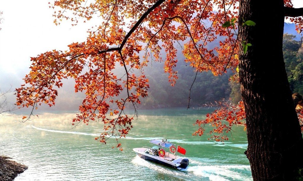 阳光透过树叶的缝隙洒下,斑驳的光影摇曳生姿,漫山红枫在碧水的映衬下,似一副浓墨重彩的画卷徐徐展开。夕阳西下,枫叶染红了山川,流光溢彩、熠熠生辉。