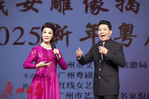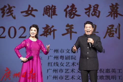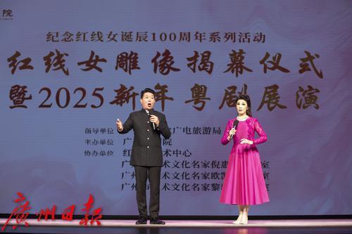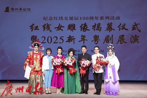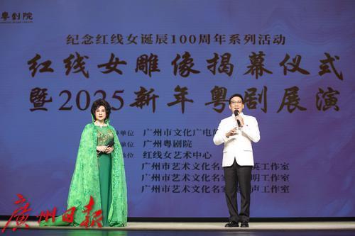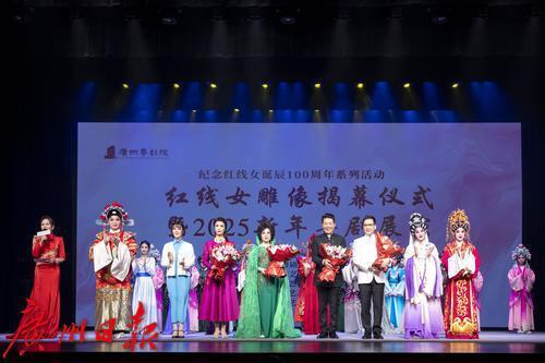 1月2日下午,在红线女雕像揭幕仪式后,2025新年粤剧展演在广州粤剧院红豆厅上演。本次展演围绕纪念主题,演出了多部马、红流派经典剧目的选段。郭凤女、欧凯明、黎骏声、苏春梅等粤剧名家演绎的《搜书院》之“初遇诉情”和《关汉卿》之“决写窦娥冤”,以及吴非凡、李嘉宜、陈振江与莫燕云等粤剧青年艺术家演绎的《山乡风云》之“对月抒怀”、《焚香记》之“行路”、《刁蛮公主戆驸马》之“三步一拜入洞房”,还有柯超杏、陈美娟、韩芳芳、黄紫茵、欧阳颖琪、蓝海韵、韩紫玮、莫彦珩等多位优秀青年演员表演的红派名曲《荔枝颂》,均有力展示了粤剧传承的生生不息和薪传火继。