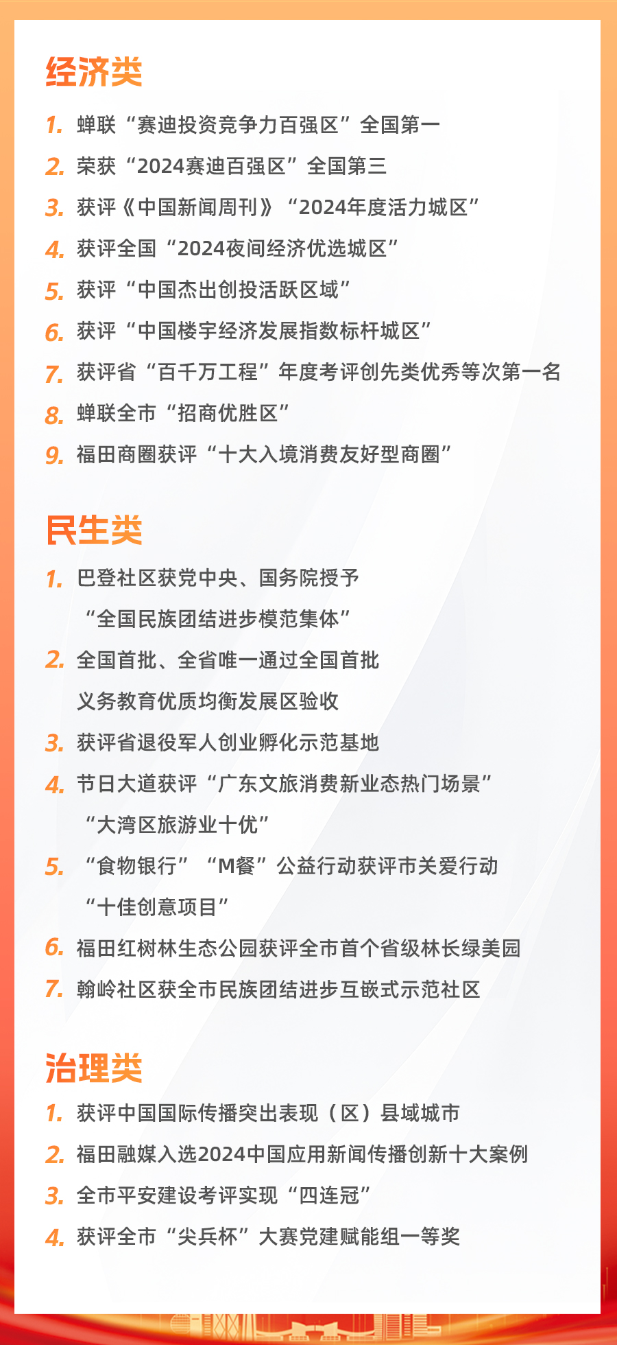 2024年,外部环境深刻变化,经济运行面临一系列超预期因素的冲击性影响。面对复杂严峻形势,福田区聚焦高质量发展首要任务、硬道理,保持战略定力、把握战略主动,迈出“二次创业”坚实步伐,推动经济发展实现稳中求进、稳中提速,进而向新、进而向优,在大战大考中交出了沉甸甸的答卷,福田经济版图深刻变化,“CBD+科创区”特征更加鲜明!这一年,福田民生事业有“新硕果”,民生措施干货满满,既提气又暖人心,让市民在一点一滴中感受到人文的关怀、民生的分量。“幸福福田”果然精彩!