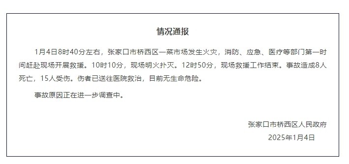 今天8时40分左右,河北张家口市桥西区一菜市场发生火灾。当地消防部门接警后,迅速前往现场扑救,上午10点多明火扑灭。12时50分,现场救援工作结束。事故造成8人遇难15人受伤,伤者已送往医院救治,目前无生命危险。