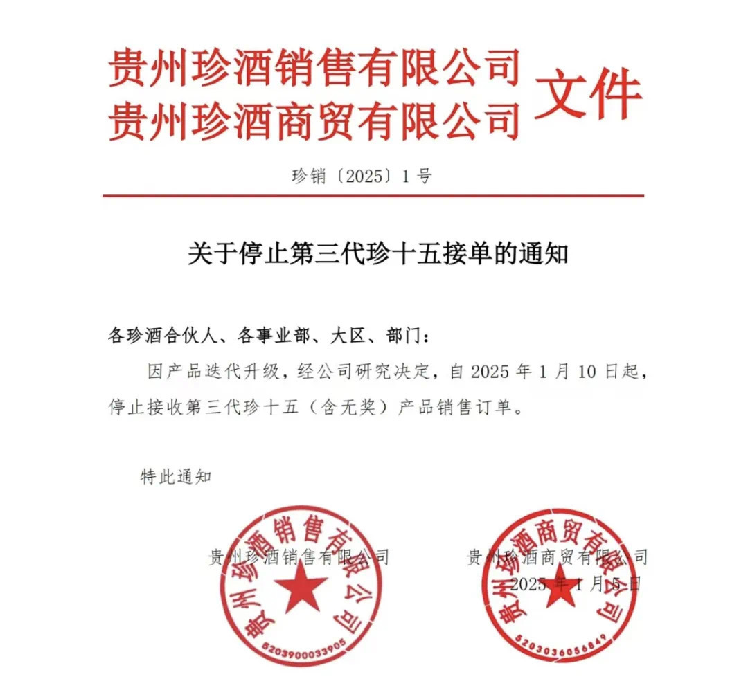 1月5日,贵州珍酒发布关于停止第三代珍十五接单的通知。通知显示,因产品迭代升级,经公司研究决定,自2025年1月10日起停止接收第三代珍十五(含无奖)产品销售订单。