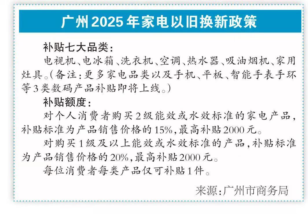 1月3日,2025广州市家电“以旧换新”补贴正式上线,涉及电视机、电冰箱、洗衣机、空调、热水器、家用灶具等七大品类。