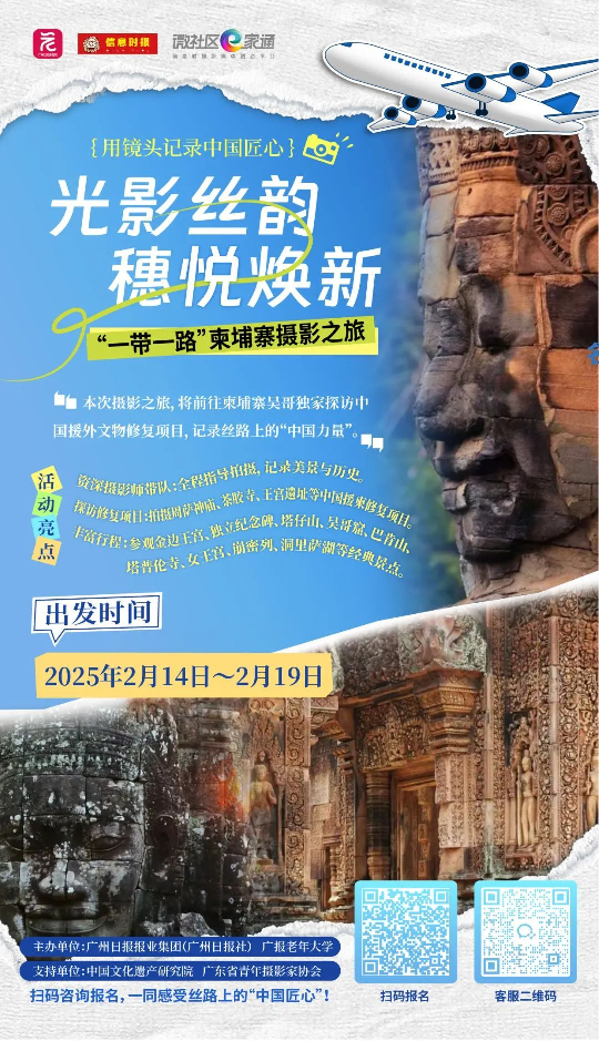 为促进文明交流互鉴,在国家文物局直属单位中国文化遗产研究院支持下,广州日报报业集团(广州日报社)联合广报老年大学推出“一带一路”摄影之旅系列活动,组织摄影团实地探访中国援外文物修复项目,用镜头记录丝路上的“中国匠心”。活动第一站,将前往柬埔寨。