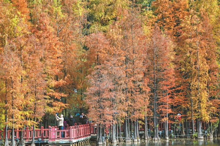 如果市民专程来看落羽杉,知识城九龙湖值得推荐。这里种植着大面积的落羽杉林,错落有致、蔚然成林,艳丽的杉林与倒映在水中的蓝天相呼应,呈现出缤纷的色彩。