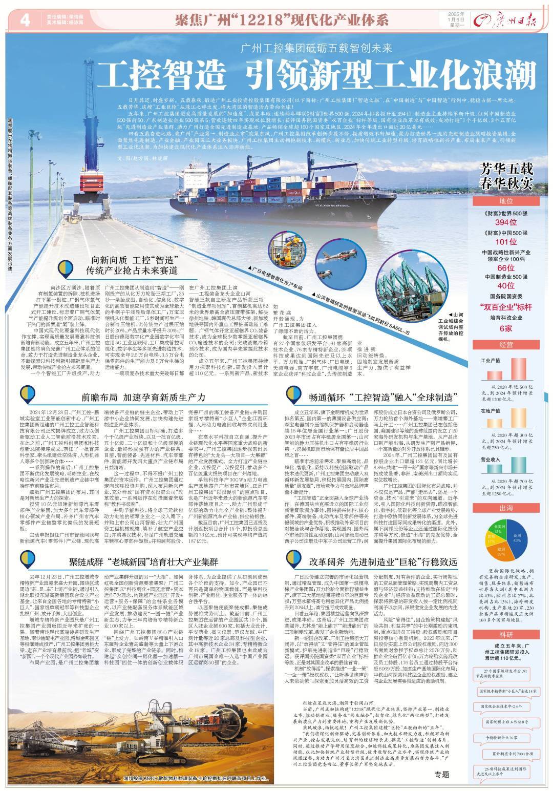 五年来,广州工控集团迸发高质量发展的“加速度”,成果丰硕:连续两年蝉联《财富》世界500强,2024年排名提升至394位;制造业主业持续革新升级,位列中国制造业500强前50,广东制造业企业500强第5;营收连续四年实现双位数增长;获评国务院国资委“双百企业”标杆等级,国有企业改革卓有成效;成功打造“1个千亿级、3个五百亿级”先进制造业产业集群,助力广州打造全国先进制造业基地;产品畅销全球超160个国家及地区,2024年全年进出口额近20亿美元……