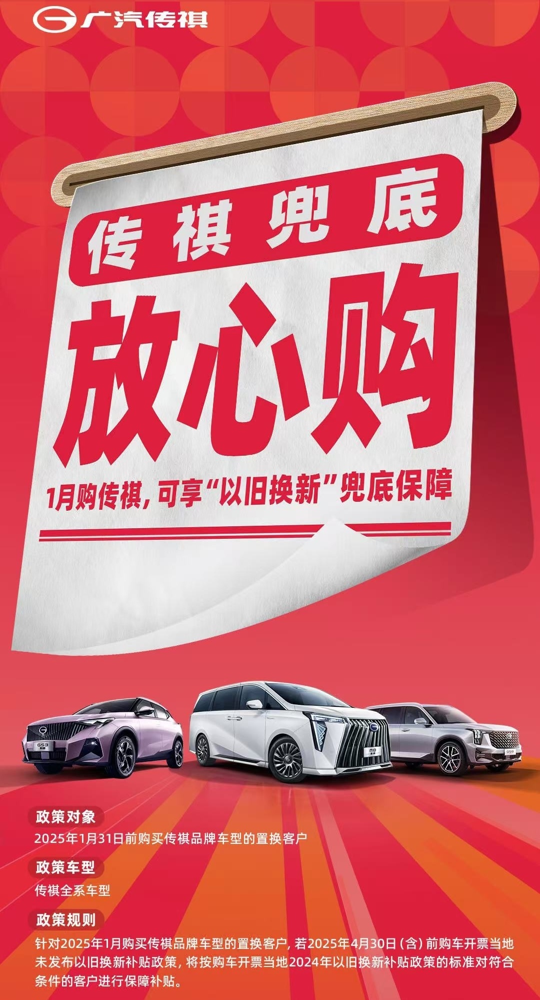 响应政策,1月6日,广汽传祺发布“以旧换新”兜底保证。即日起,到2025年1月31日,购买传祺品牌车型的置换客户,若2025年4月30日前购车开票当地未发布以旧换新补贴政策,将按购车开票当地2024年以旧换新补贴政策的标准对符合条件的客户进行补贴。以广州为例,符合标准的置换用户至少可享1.5万元“国补”,旧车报废车则是2万元。