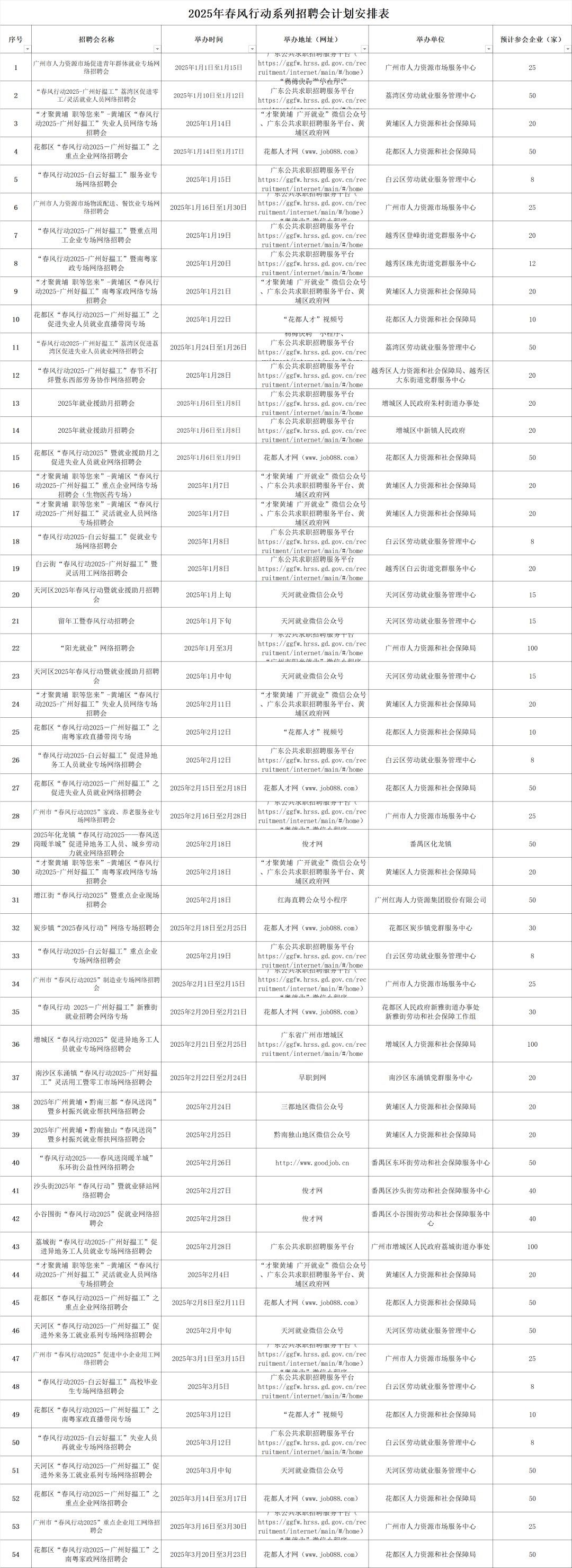 据悉,春风行动活动期间,市、区两级公共就业服务机构将提供职业介绍、信息发布、职业指导、直播带岗、政策咨询等就业服务,推动各类群体实现有效就业。线上方面,有需要的群众可以登录广东公共求职招聘服务平台、“粤就业”微信小程序、“广州公共招聘”微信小程序、各级公共就业服务机构的各类线上服务平台查看活动安排、招聘活动预告、岗位信息等各类就业服务资讯。