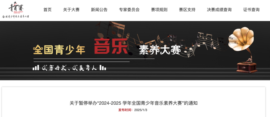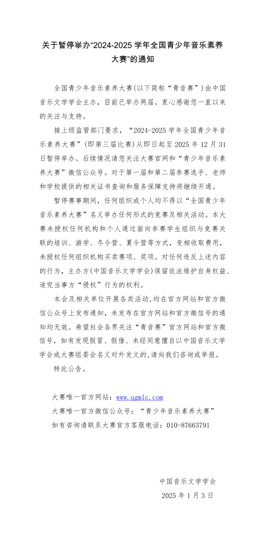 1月3日,中国音乐文学学会在全国青少年音乐素养大赛官网发布《关于暂停举办“2024-2025学年全国青少年音乐素养大赛”的通知》。主办方在通知中表示,接上级监管部门要求,“2024-2025学年全国青少年音乐素养大赛”(即第三届比赛)即日起至2025年12月31日暂停举办。
