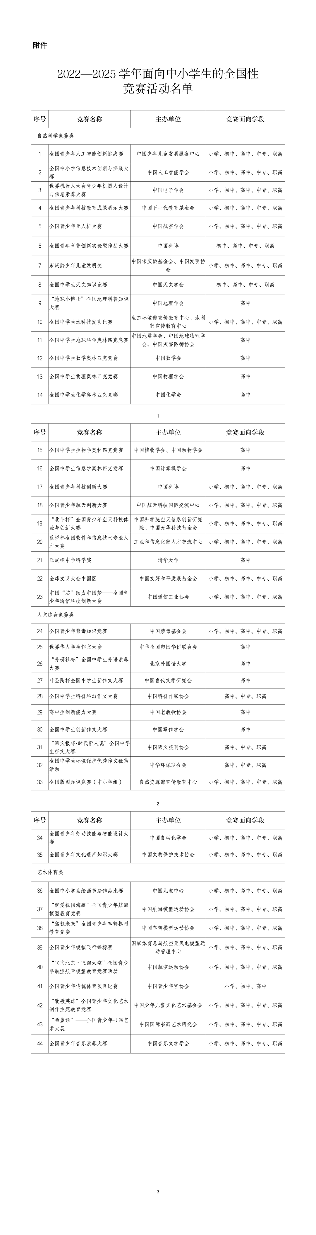 教育部公布的2022-2025学年面向中小学生的全国性竞赛活动名单如下: