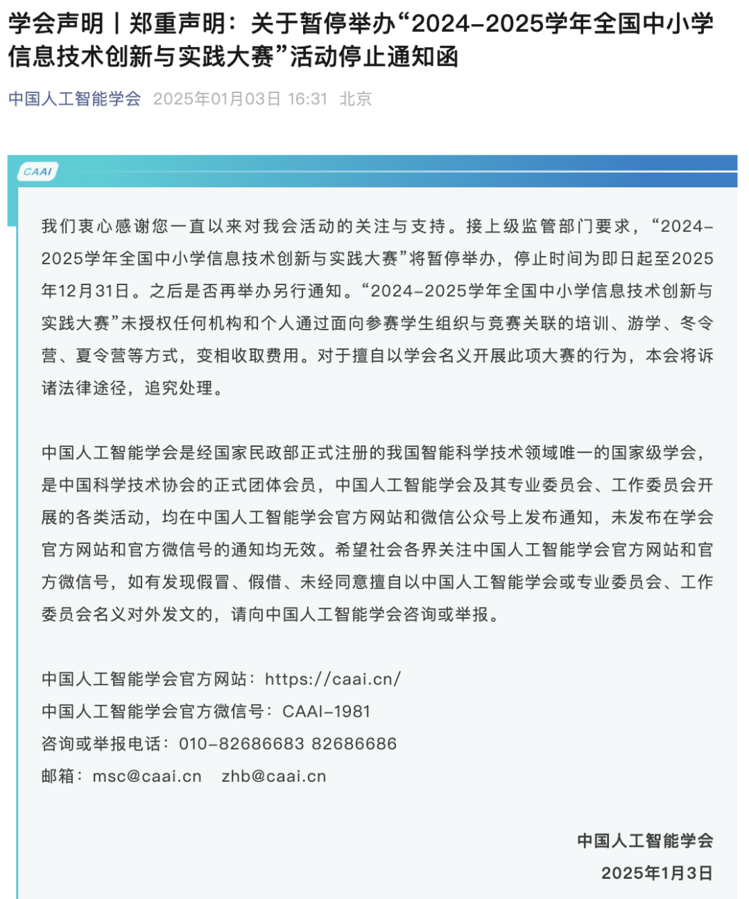 1月3日,中国人工智能学会在其公众号发布《关于暂停举办“2024-2025学年全国中小学信息技术创新与实践大赛”活动停止通知函》,其中提及,接上级监管部门要求,“2024-2025学年全国中小学信息技术创新与实践大赛”将暂停举办,停止时间为即日起至2025年12月31日。之后是否再举办另行通知。