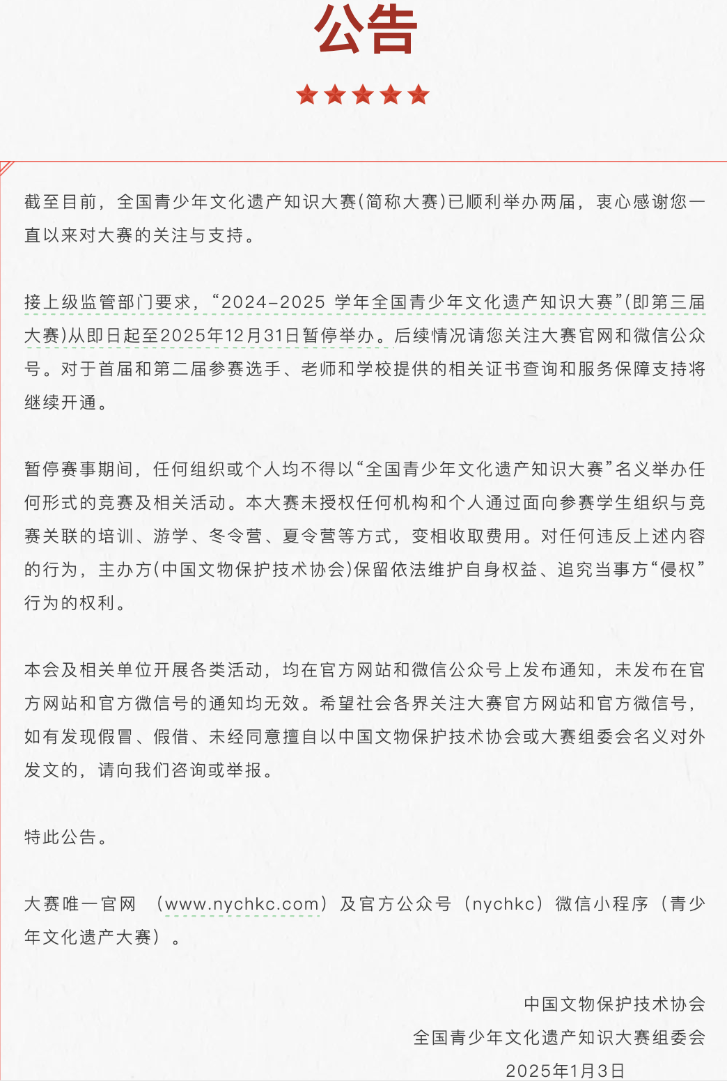 1月3日,中国文物保护技术协会全国青少年文化遗产知识大赛组委会在“青少年文化遗产”公众号发布公告称,接上级监管部门要求,“2024-2025学年全国青少年文化遗产知识大赛”(即第三届大赛)即日起至2025年12月31日暂停举办。