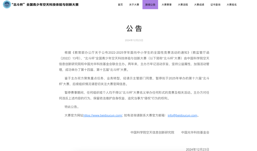 12月23日,“北斗杯”全国青少年空天科技体验与创新大赛的联合主办方(中国科学院空天信息创新研究院和中国光华科技基金会)在大赛官网发布公告称,鉴于主办双方聚焦重点任务、业务转型,经请示主管部门同意,暂停拟于2025年举办的第十六届“北斗杯”大赛,后续组织情况可关注大赛官网信息。