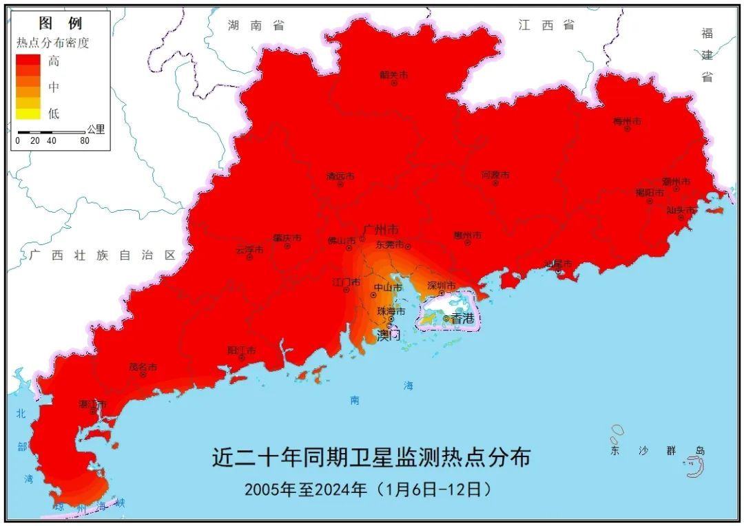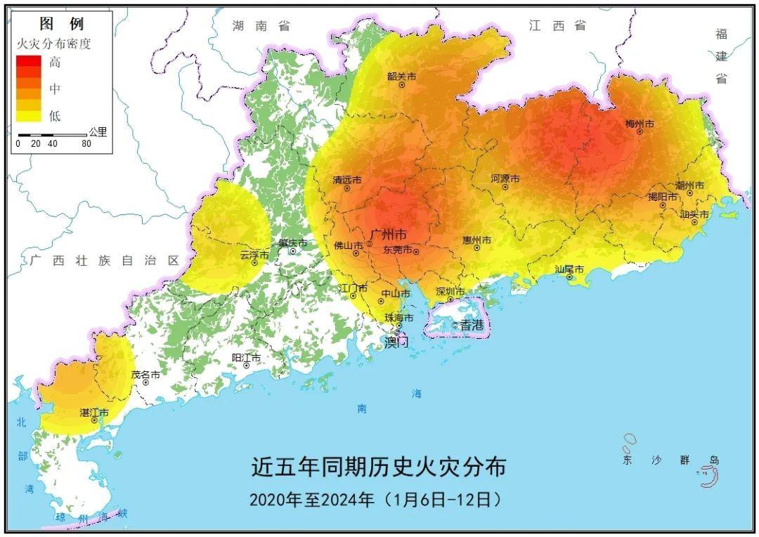 火源情况方面,历史同期火源中,本时段近二十年历史同期卫星热点数量较上周增加了6倍,韶关、河源、梅州、惠州、肇庆、清远等地卫星热点较多。本时段近20年卫星热点中,经核实反馈林火占比3%,农事用火占比41%,计划用火占比19%。